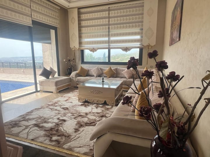 Stap in een wereld van grandeur en tijdloze elegantie in deze uitzonderlijke villa in Al Bahraouine, Tanger. Dit is niet alleen een verhuur, het is een ervaring van koninklijk Marokkaans leven, waar traditionele architectuur samenkomt met moderne luxe, en elke hoek een verhaal vertelt van verfijnde smaak en genereuze gastvrijheid.