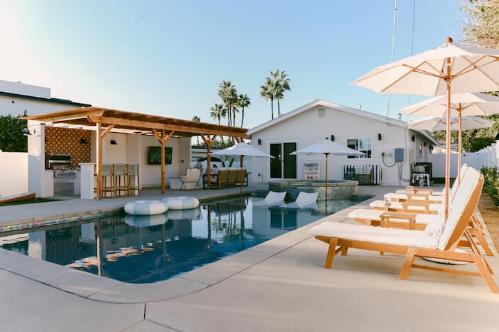 Welkom bij The Sapphire, een onlangs gerenoveerde luxe strandretraite op slechts een paar minuten lopen van stranden van wereldklasse. Geniet van je eigen achtertuin in resortstijl met verwarmd zwembad, spa met waterval, cabana, vuurplaats, BBQ, cornhole en tv buiten.