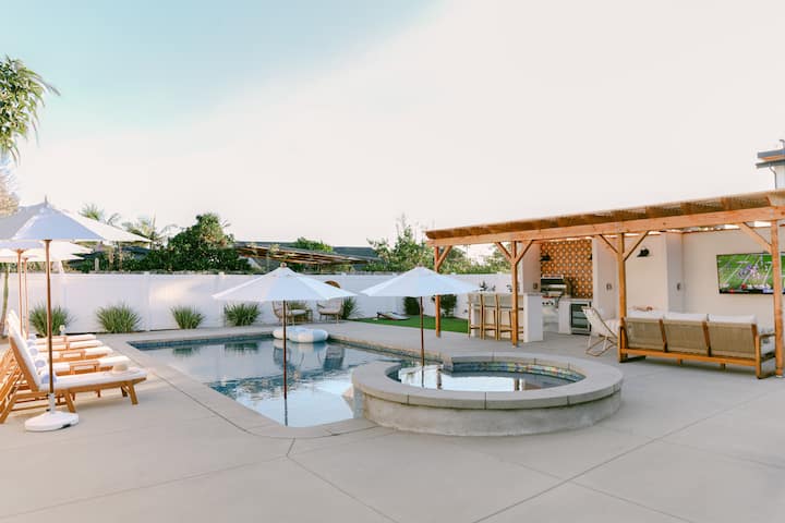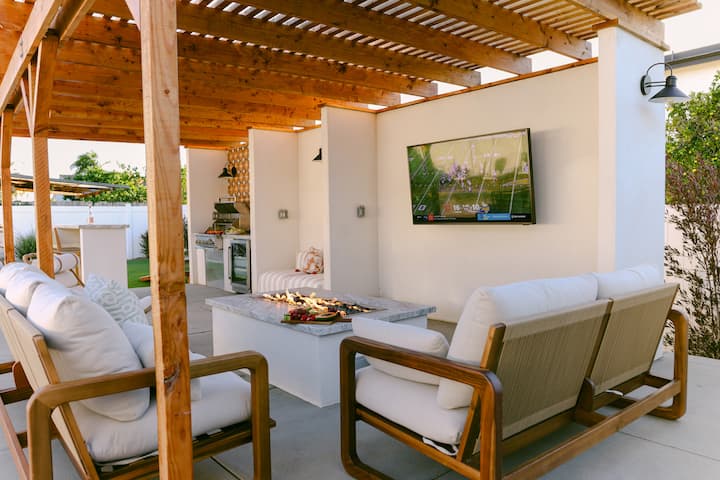 • Buitentv met YouTube TV + NFL Sunday Ticket (in het seizoen), zodat je de wedstrijd kunt bekijken vanaf het zwembad, de spa, de vuurplaats of de BBQ