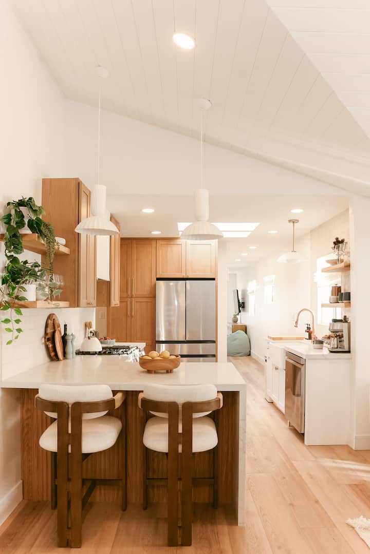 Kook, snack of vermaak in de designkeuken aan de kust met lichte houten kasten, stenen aanrechtbladen en een ruim eiland. De keuken is volledig uitgerust met kookgerei, bakgerei en servies voor je hele groep. Geniet van zowel een koffiezetapparaat als een espressomachine met lokale bonen om je ochtenden te beginnen voordat je naar het strand wandelt. Binnenshuis eten stroomt gemakkelijk vanuit de keuken, zodat iedereen samen kan eten zonder zich krap te voelen.