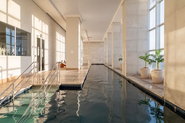 Gedeeld binnenzwembad – het hele jaar beschikbaar, specifieke openingstijden, baantjesbad, verwarmd