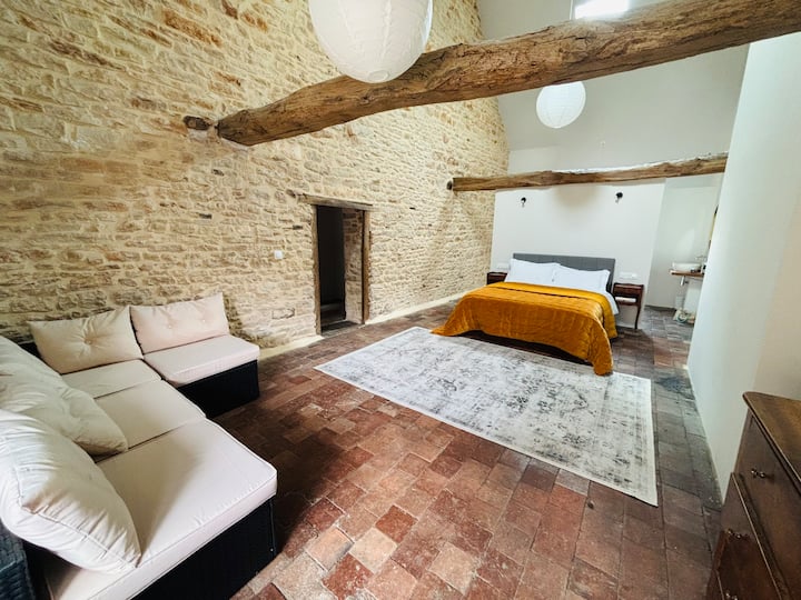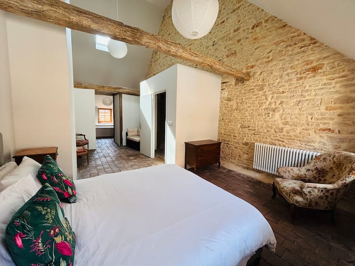 Le 6 Grande Rue ligt bij de ingang van de middeleeuwse Cité van Saint-Gengoux-le-National en vertegenwoordigt 5 jaar werk dat door lokale ambachtslieden is uitgevoerd om de vele originele kenmerken op te halen en te herstellen en het terug te brengen naar zijn oude glorie, terwijl het zachtjes in de 21e eeuw wordt gebracht.