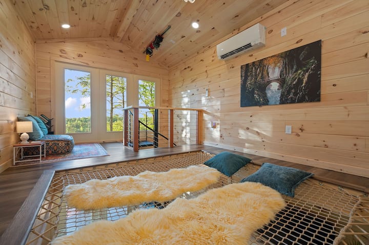 Gasten kunnen gebruikmaken van het hele Deluxe Birdhouse, inclusief de bovenste en onderste verdiepingen, het bubbelbad, de loft, de glijbaan en alle buitenvoorzieningen. Vanaf het moment dat je parkeert, steek je je eigen privébrug van 9 meter over naar een volledig toegewijde boomtopretraite - geen gedeelde ruimtes, geen nabijgelegen eenheden en geen onderbrekingen.