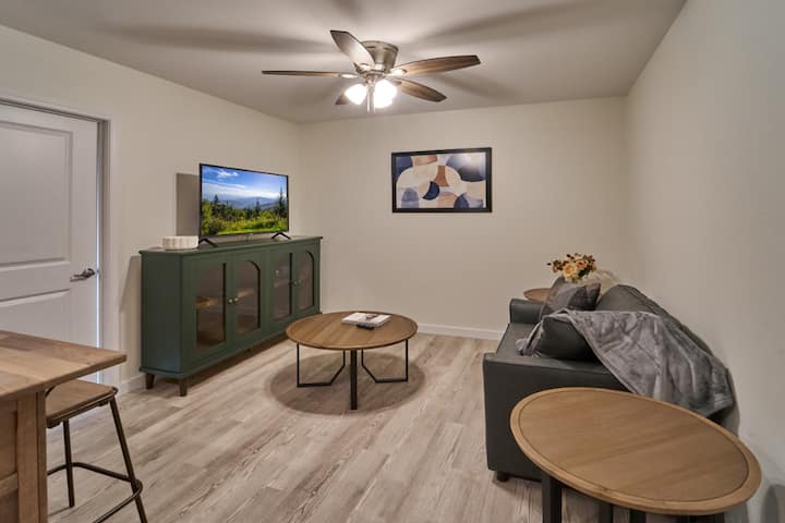 Stap in een lichte, uitnodigende ruimte waar modern comfort en gezellige charme samenkomen. De woonkamer is ontworpen voor ontspanning, met een open indeling die het gemakkelijk maakt om te ontspannen na een hele dag vol met het verkennen van de Smokies. Kruip op de bank met je favoriete boek, geniet van een filmavond met kabel-tv of stream je favoriete programma's met snelle wifi via glasvezel. Grote ramen vullen de kamer met natuurlijk licht, waardoor een vrolijke, luchtige sfeer ontstaat die vanaf het moment dat je aankomt als thuis voelt.