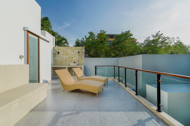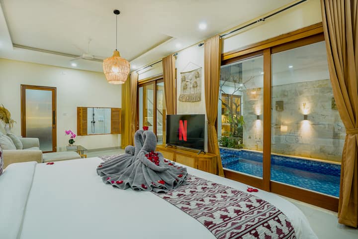 De villa biedt een gezellige hoofdslaapkamer met een 55 inch smart-tv, perfect om te ontspannen na een dag vol verkenning. De keuken en eethoek zijn geschikt voor je culinaire behoeften, terwijl het privézwembad een verfrissende ontsnapping biedt. Boven nodigt een loungeruimte met ligbedden je uit om te genieten van de tropische zon of te genieten van rustige momenten onder de lucht.