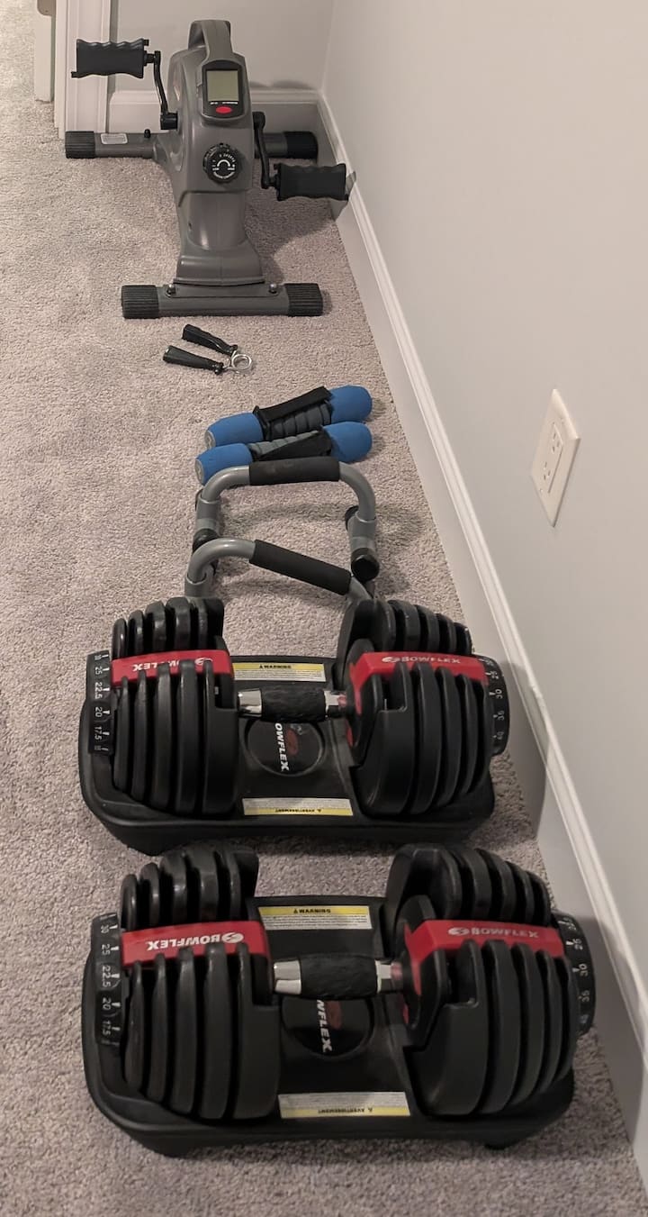 Voor je workouts: een loopband, een yogamat en losse gewichten.