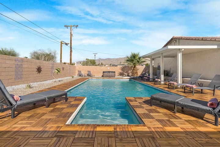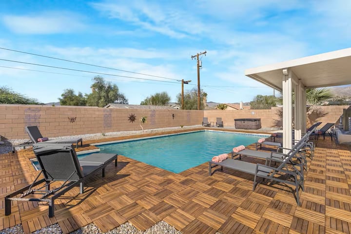 Welkom bij je perfecte woestijnvakantie - een uitnodigende retraite ontworpen voor plezier, ontspanning en onvergetelijke herinneringen. Deze nieuw ontworpen vakantiebestemming voor volwassenen of gezinnen beschikt over vier slaapkamers plus een speelkamer en een grote woonkamer, en een nieuw basketbalveld, putting green, arcade speelkamer met Fast & Furious en NBA, een full-size 8' biljarttafel met een tafeltennis (pingpong top), en nog veel meer, zoals een groot zwembad en spa tegen de prachtige bergen!