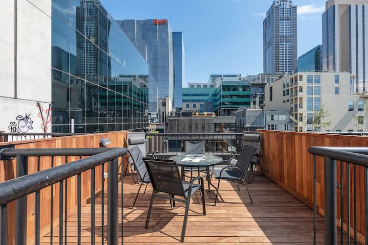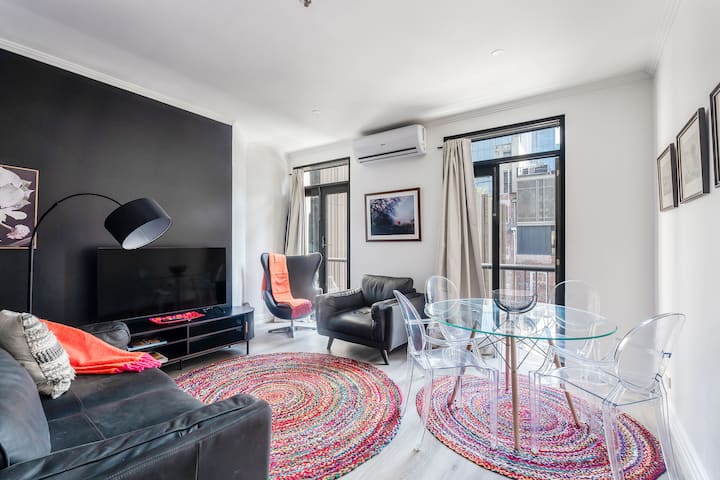 Dompel jezelf onder in de creatieve energie van Melbourne vanuit dit opvallende appartement met drie verdiepingen in het hart van de CBD. Stijlvol en uitnodigend, het combineert een somber zwart interieur met levendige kleuren en een prachtig uitzicht op de stad. Een echt hoogtepunt is het privéterras op het dak - een zeldzaam toevluchtsoord in de binnenstad waar je boven de drukte kunt ontspannen, kunt genieten van drankjes bij zonsondergang of de dag kunt beginnen met uitzicht op de skyline. Stap naar buiten om trendy cafés, veelgeprezen eetgelegenheden en eersteklas winkelgebieden op slechts enkele ogenblikken afstand te ontdekken.