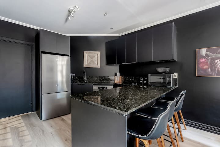 De keuken zet de verfijnde esthetiek van het appartement voort met donkere kasten en stenen werkbladen, volledig uitgerust om eenvoudig te koken. Een ontbijtbar met krukken en een nabijgelegen eethoek bieden ontspannen ruimtes voor koffie in de ochtend of gedeelde maaltijden voordat je de stad gaat verkennen.