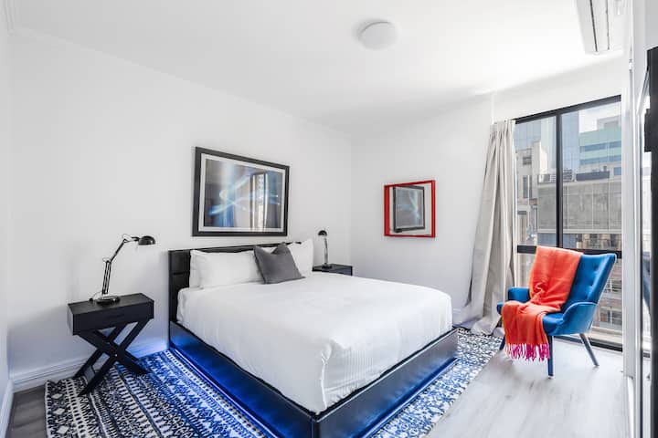 Boven bieden twee slaapkamers met queensize bedden een rustig contrast met frisse witte muren, zachte verlichting en accenten van fluweelblauw en oranje. Elke kamer is voorzien van airconditioning, verduisterende jaloezieën en ingebouwde opbergruimte voor een rustgevend verblijf. De badkamer heeft een inloopdouche met regendouche, een apart toilet en gratis toiletartikelen, zodat je elke dag alles hebt wat je nodig hebt in een compacte omgeving. Voor een langer verblijf voegt een eigen wasserette met een wasmachine en droger praktisch gemak toe.
