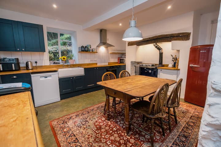 De grote eetkamer behoudt zijn originele tegelvloer en biedt zitplaatsen voor de hele groep om samen van maaltijden te genieten. De recent ingerichte keuken is goed uitgerust voor catering voor grote feesten, met een groot Rayburn-oliefornuis, dubbele Belfast-gootsteen en alle apparaten die nodig zijn voor een onvergetelijk verblijf, waaronder een elektrische oven/kookplaat en een grote airfryer. Een extra koelkast/vriezer bevindt zich in de eetkamer, terwijl een wasmachine handig buiten de doucheruimte op de begane grond is geplaatst. Het gelijkvloers wordt aangevuld door een charmante veranda met originele vloeren en een keuze aan zitplaatsen, met uitzicht op de achtertuin en directe toegang tot de afgesloten patio.