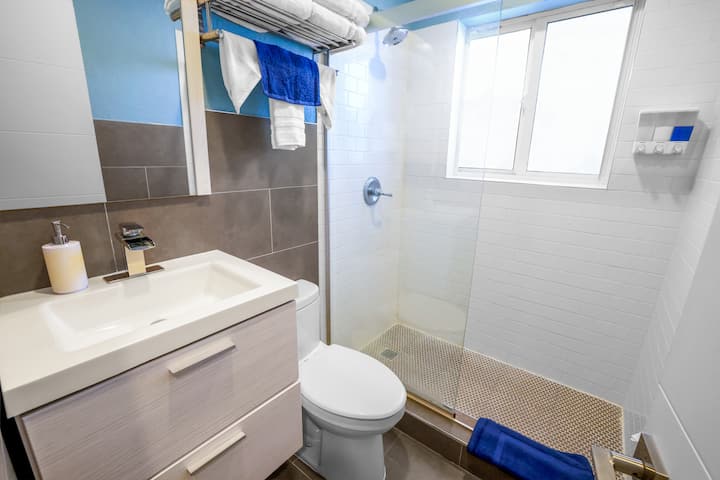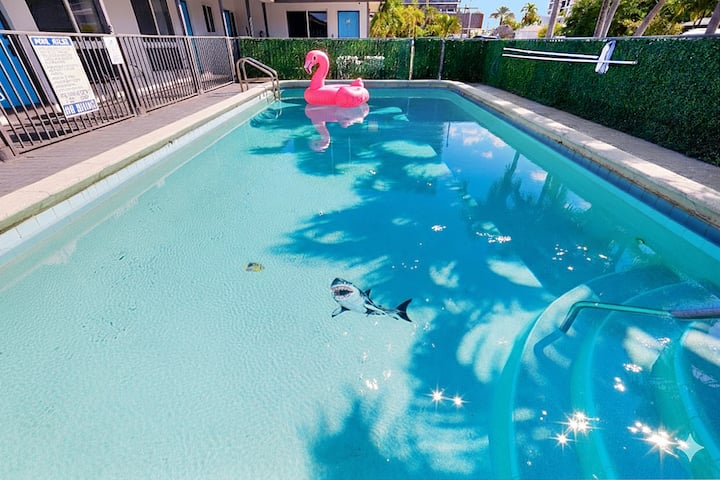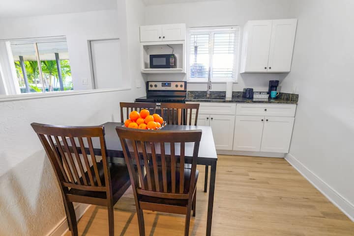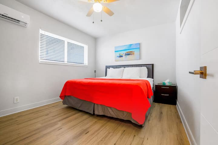 2 minuten LOOPEN naar het STRAND! Trendy Condo|King|Keuken|Zwembad