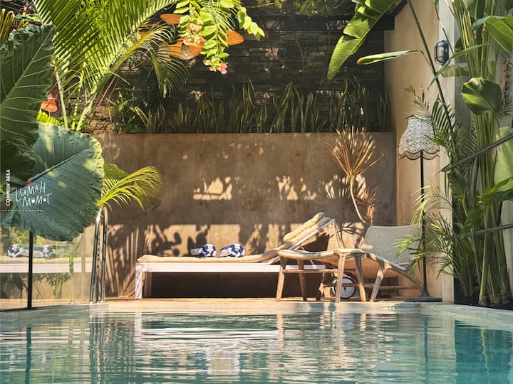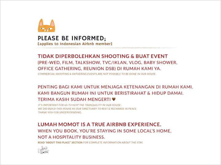 Ik heb het erg koud en heb huisarrest, het is allemaal natuurlijk bij mij, ik zal blij zijn als gasten het gevoel hebben dat ze thuis zijn. Ik geniet van de energie van echte, aardige, nederige mensen. Ik hou van dieren. Ik heb honderden katten, 4 honden, weinig vogels, een paard en een koe gered — op dit moment zorg ik voor 22 katten, 3 honden, een koe en een paard. De katten en honden leven bij me. Ik ontwierp mijn eigen huis, Lumah Momot; ik ben altijd een 'kampong' -meisje geweest dat zich het meest op zijn gemak voelt in de natuur, ook om mijn dieren goed te huisvesten, besloot ik een half-buitenhuis te bouwen, het huis dat je nu in de advertentie ziet.