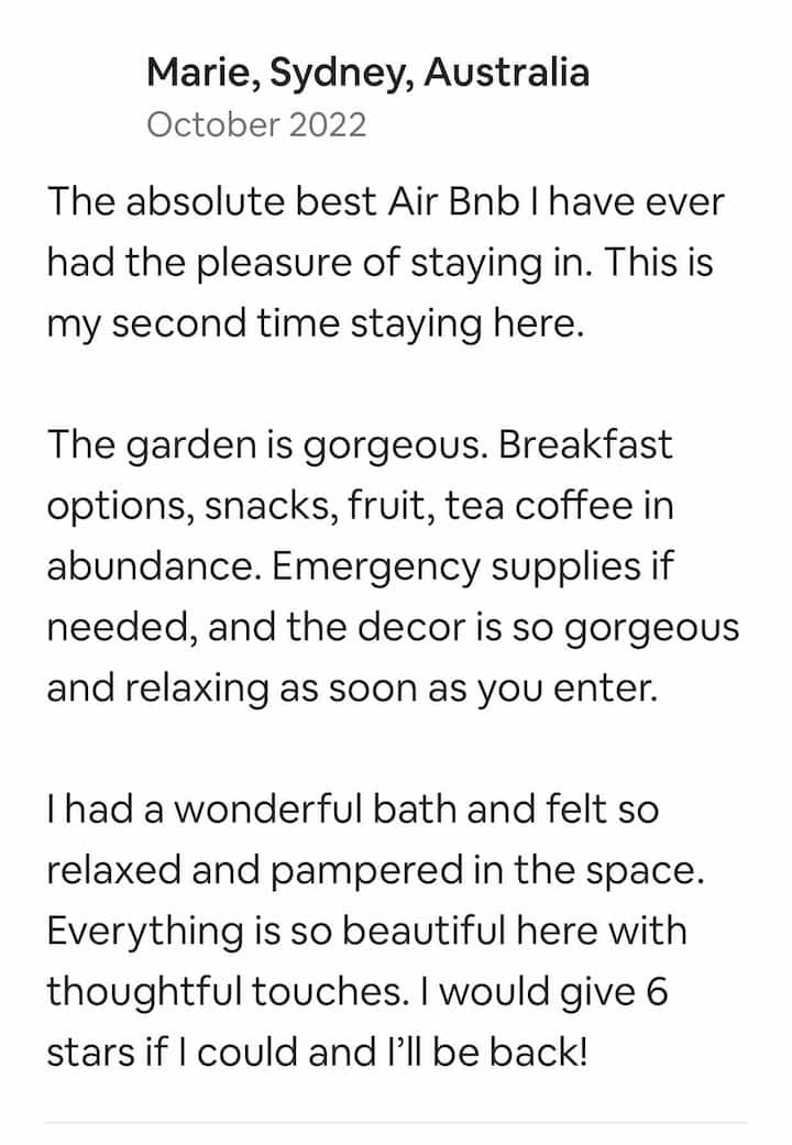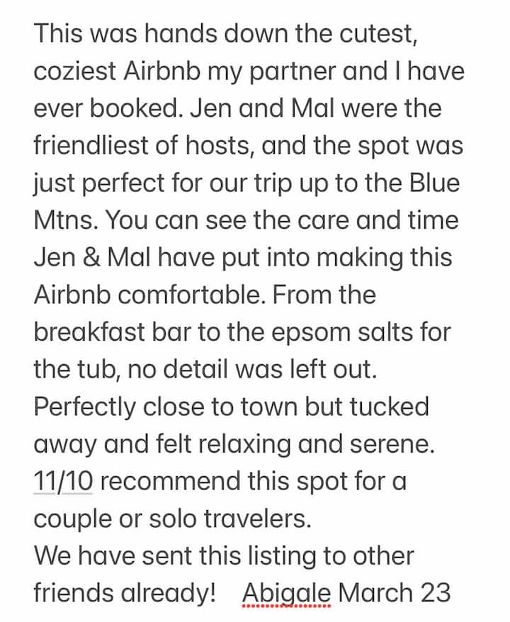 We wonen al een paar jaar in de Blackheath, we hebben op deze manier veel fijne feestdagen gehad en besloten er ons thuis van te maken. Wij houden van tuinieren, koken en eten en tijd doorbrengen met familie en vrienden. We hebben op Airbnb-plekken verbleven tijdens het reizen en genoten van de interactie met de lokale bevolking en de diversiteit van de accommodatie. We zijn dol op projecten, of het nu gaat om het renoveren, het bouwen van een chook run, een schuur of een hek, we houden gewoon van de uitdaging. Het prachtige landschap voor onze deur, drankjes bij zonsondergang op Mt Blackheath of een regelmatige reis naar een lokaal uitkijkpunt, zo dichtbij en rustig is een constant genot. Airbnb verhuren is onze nieuwe uitdaging en we hopen net zoveel gelukkige herinneringen voor onze gasten te initiëren als anderen voor ons hebben gedaan.