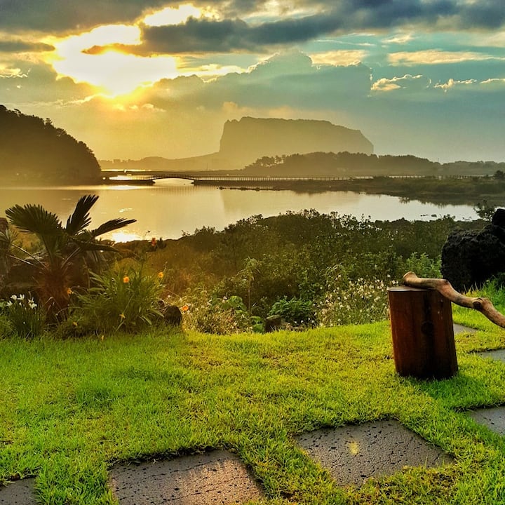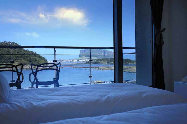Wanneer de ochtendzon wordt verlicht terwijl je naar Seongsan Ilchulbong Peak en Udo kijkt, kun je de blauwe zee bewonderen, de voortuin van Ojo-sook, in de slaapkamer waar de blauwe zee, de voortuin, in het raam ligt.