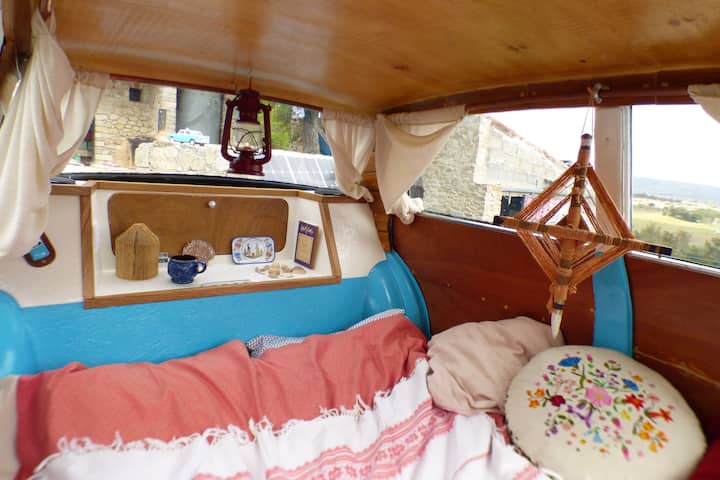 Het is nu uitgerust met een comfortabele dubbele matras, bagage-opslag toegankelijk vanaf uw bed, gordijnen, Wifi, radio met Bluetooth en stopcontacten om uw telefoon en laptop op te laden. De gezellige kattenradio is vooraf geladen met Franse muziek uit de regio.