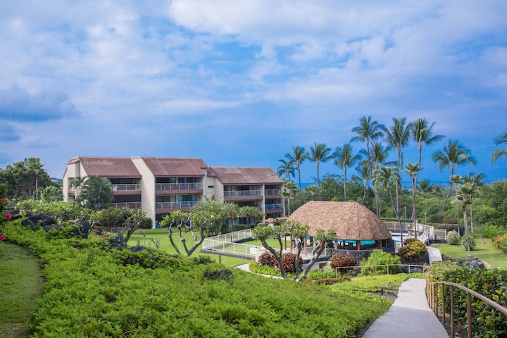 1. UITZICHT OP DE OCEAAN EN UITZICHT OP DE GOLFBAAN direct over de 8e green - ZEER zeldzaam! Kijk overdag naar de golfers en geniet 's nachts van de adembenemende Hawaïaanse zonsondergangen, allemaal vanuit het comfort van je eigen lanai op de begane grond.