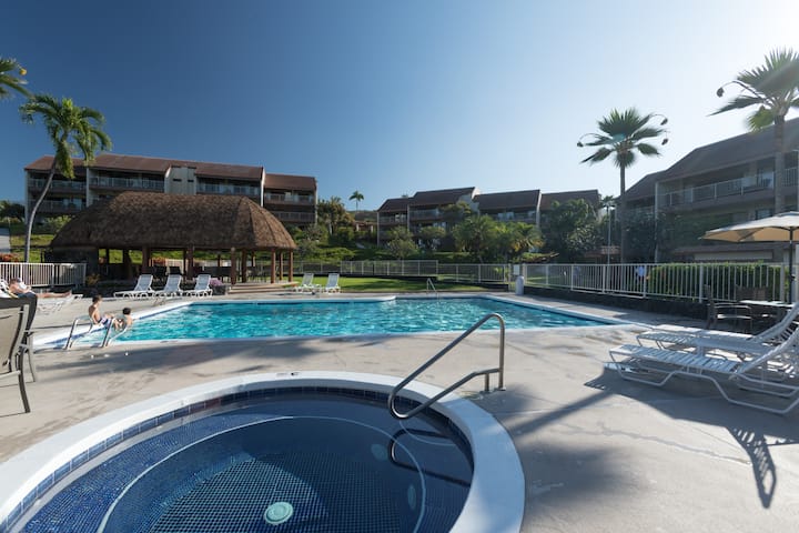 Ontspan in tropische luxe op The Salty Mermaid, een prachtig appartement met 2 slaapkamers en 2 badkamers direct aan de 8e fairway van de Kona Country Club Golf Course. Deze retraite van 1200 vierkante meter met een prachtig uitzicht, prachtige zonsondergangen en een zeebries biedt alle ruimte en sereniteit die je nodig hebt om te resetten, op te laden en opnieuw verbinding te maken.