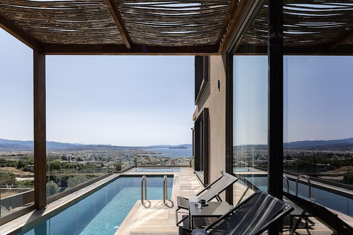 Gelegen op een eersteklas heuvelachtig gebied met uitzicht op de havenstad Chania, bieden Omma Villas een uniek uitgebreid en onbelemmerd panoramisch uitzicht op het stedelijke landschap en de Kretenzische Zee.