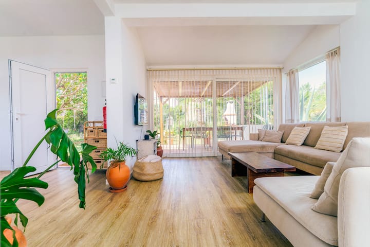 Huis, tuin, uitzicht op het meer, 5 minuten rijden naar het strand