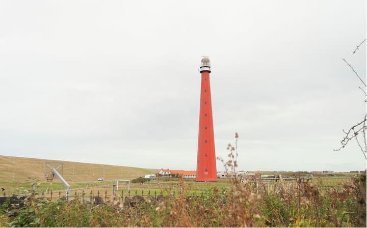 Huis onder de Vuurtoren, aan de dijk en de zee.
