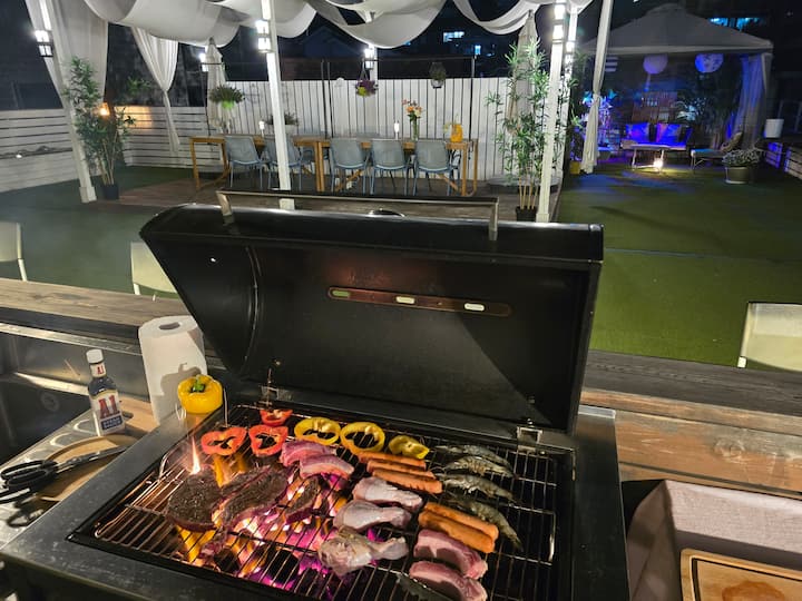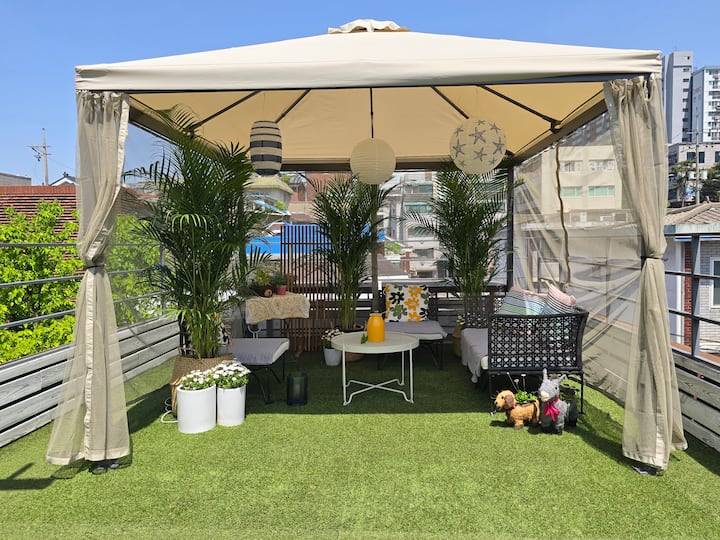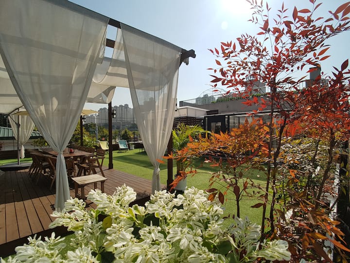 Vergeet de vermoeidheid van de stad in het café op het dak en het tuinhuis, en ontspan en geniet!