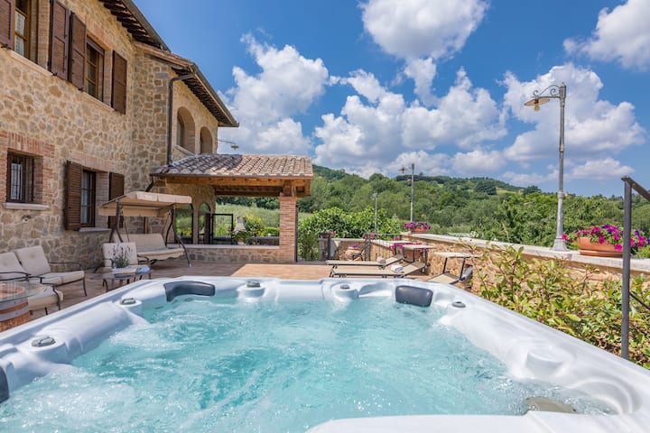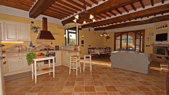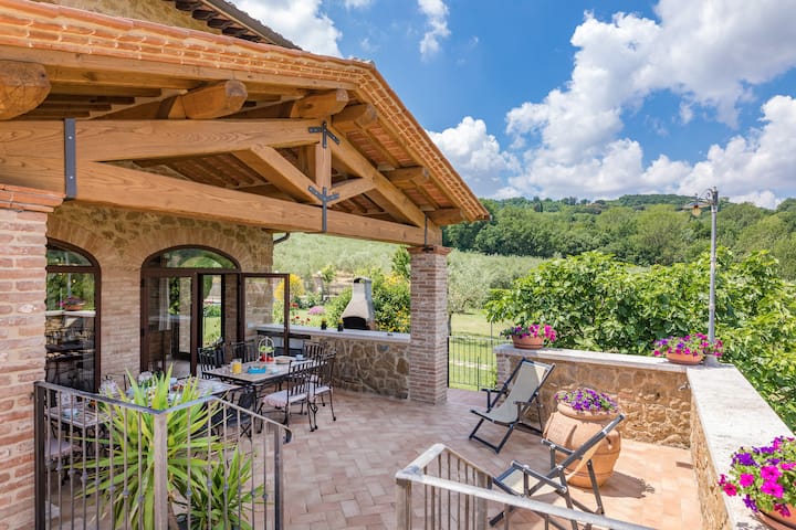 Een boerderij ondergedompeld in wijngaarden aan de voet van Montepulciano: dit is de prachtige omgeving die Le Terre di Nunzio omhult, een volledig gerenoveerd stenen huis met een rustieke lucht, klaar om zijn gasten te verwelkomen die, ondanks het feit dat het slechts een minuutje van de beroemde borgo is, bekend als "de parel van de Val di Chiana", dicht bij de Val d'Orcia, kan genieten van de discrete en rustige sfeer, gegarandeerd door de rust van het meest typische Sienese platteland.