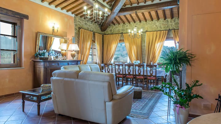 Uitgerust met alle moderne gemakken, heeft het huis grote, lichtgevende en gastvrije kamers waar traditie heerst en de materialen het resultaat zijn van het beste lokale traditionele vakmanschap: terracotta, hout voor de plafondbalken en de vloeren van het slaapgedeelte, fijn travertijn marmer voor de badkamers en open haard. Het meubilair combineert perfect met de pasteltinten van de muren en bekleding en definiëren een harmonieus noemenswaardig geheel, afgenomen in de kleuren van de natuur gezien vanuit de ramen; een intieme sfeer wordt ingeademd in de slaapkamers, met smeedijzeren bedden, bloemenversieringen en luifels. Buiten bieden het enorme terras en het zwembad een uniek uitzichtpunt over de nette rijen wijnstokken die het pand omarmen dat de heerlijke nectar van de goden zal produceren, de beroemde Nobile di Montepulciano, gemaakt van een zeer hoge kwaliteit Sangiovese druif die hier in zijn puurste essentie kan worden genoten. Gelegen op de heuvel, is de borgo in al zijn glorie te zien: het bewonderen bij zonsondergang terwijl je met een glas rode wijn aan het zwembad zit, zal een echt magische ervaring zijn. De locatie van dit huis maakt het de ideale bestemming voor diegenen die graag reizen, met de fiets of auto, de schilderachtige wegen die door het uitgestrekte gebied rond Siena slingeren, eenvoudige, essentiële geneugten ontdekken - de smaak van echte keuken, goede wijn met zijn onmiskenbare aroma, de natuur briljant en harmonieus in een veelheid aan kleuren en geuren, de prachtige kleine stadjes doordrenkt van kunst en traditie, zoals Montalcino, San Quirico, Cetona, Cortona, allemaal in de directe omgeving. Tot slot, om af te ronden met een gevoel van welzijn, kan een verjongend bezoek aan de nabijgelegen prestigieuze spa 's van Montepulciano, Bagno Vignoni, Chianciano en San Casciano dei Bagni niet worden gemist.