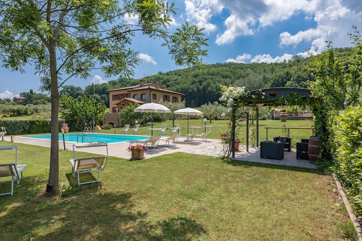 Van de toegangspoort tot het prachtige park, omgeven door 6 hectare wijngaard, worden gebieden die in steen zijn geplaveid, afgewisseld met gebieden van goed onderhouden gazon, begrensd door rozenstruiken, lavendel, kruiden en klimmende jasmijn. Cypressen en oleanders, olijf-, appel- en vijgenbomen verlevendigen de tuin terwijl de georganiseerde ruimtes zijn ingericht met kleurrijke bloembedden. In een ver hoekje van het park, naast het zwembad, staat een grote boomgaard met diverse fruitbomen. Drie ruime portieken maken je tijd buiten aangenaam en comfortabel; de eerste, met directe toegang vanuit de woonkamer/keuken, perfect om te genieten van heerlijke maaltijden, strekt zich uit langs een breed, panoramisch terras uitgerust met tafeltennis en tafelvoetbal, terwijl de tweede, opgezet met banken en fauteuils, perfect is om te ontspannen met een goed boek of te kletsen met vrienden. De laatste, op slechts een paar meter van het huis, is een speeltuin met fitnessapparatuur, tafeltennis en tafelvoetbal. Op het prachtige panoramische terras, niet ver van de eerste patio, is er een buitenverwarmde jacuzzi voor 6 personen. Naast het zwembad is een speelruimte voor kinderen met glijbaan en schommel. De woning heeft een alarmsysteem en een parkeerplaats.