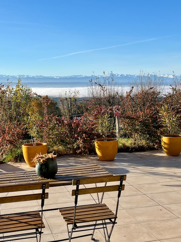 Geniet van een bevoorrecht moment van ontspanning met uitzicht op de Pyreneeën, of het nu 25 of 10 graden is.
