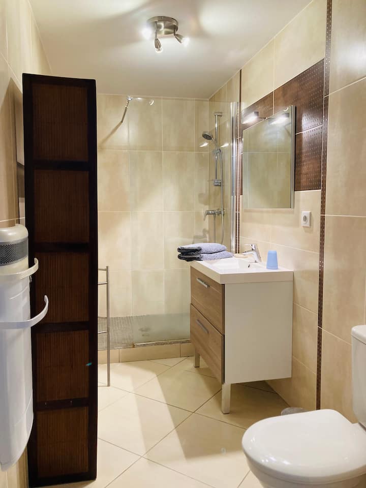 - 1 badkamer met douche, WC, wastafel, handdoekdroger