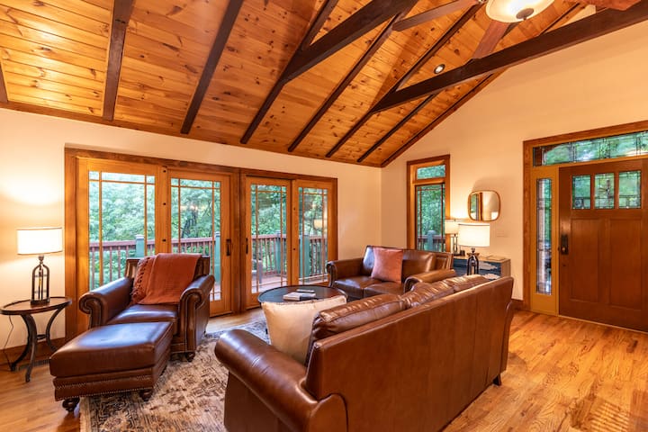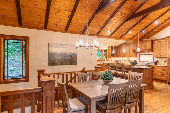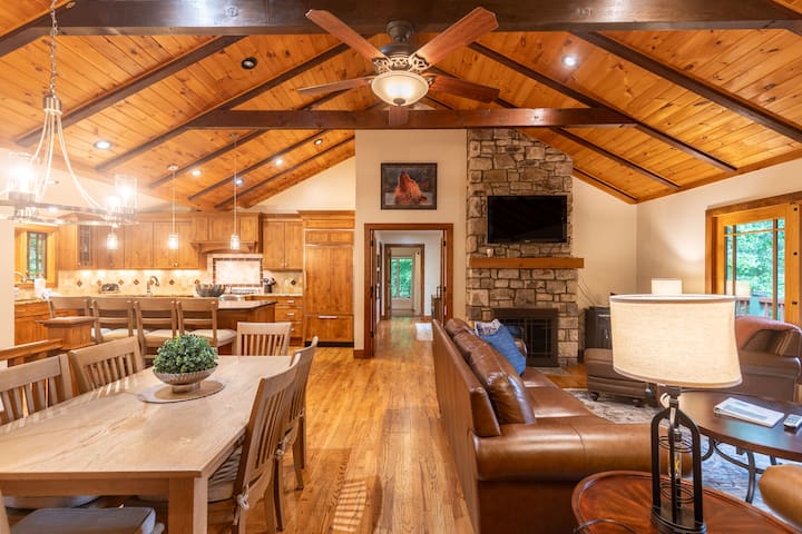 Rustiek ontmoet modern in deze onlangs vernieuwde bosrijke retraite gelegen in Hound Ears Club, op slechts een kwartier rijden van Boone, Blowing Rock en Banner Elk. Hoewel genesteld tussen de bomen, heeft de woning een prachtig uitzicht vanaf de bovenste en onderste verdieping. Met een gelijkvloerse ingang en een Master Suite op de begane grond is gemoedsrust ook een geweldige optie voor mensen met beperkte mobiliteit.