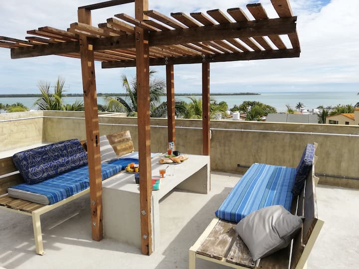 Er is een prachtig gedeeld dakterras met 360 dgrees prachtig uitzicht op de bergen en de oceaan met yoga-ruimte voor al onze gasten en een schaduwrijke gemeenschappelijke eetbank voor zonsondergangen en sterrenkijkers. Dit is een kite en wind surfen hot spot en de natuur en wandelen in dit gebied is ongeëvenaard.