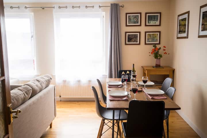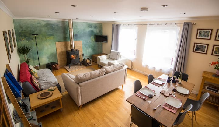 Bij aankomst biedt de lichte hal een galerij met lokale fotografie aan de muren, en in dit bedrieglijk ruime split-level huisje vind je een houtkachel als het middelpunt van de woonkamer voor al je gezellige avonden, samen met een smart-tv, comfortabele sofa 's en een eettafel voor zes personen met verhoogd uitzicht over het dorp naar de heuvels daarachter. De moderne keuken is goed uitgerust met alle benodigdheden die je nodig hebt om van een zelfgemaakte maaltijd te genieten, en het lokale dorp met zijn pubs en cafés ligt voor de deur als je uit wilt eten.