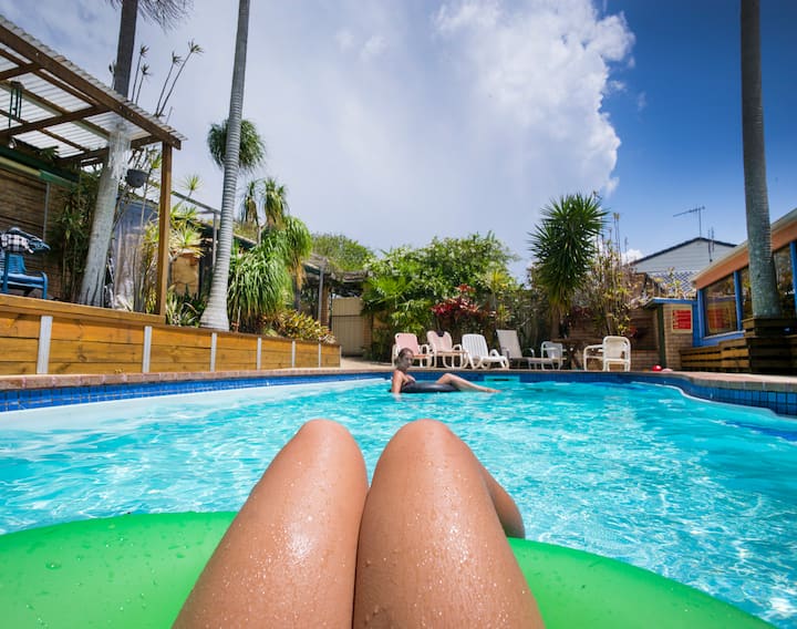 Ozzie Pozzie ligt halverwege Sydney en Byron Bay en lijkt meer op een resort dan op een backpacker hostel. Gasten kunnen ontspannen in de cabana aan het zwembad, zwemmen of pauzeren in een hangmat onder palmbomen.