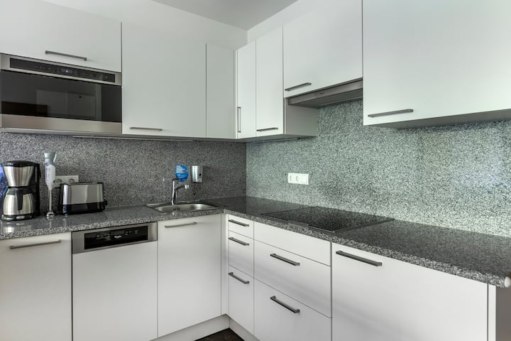 In de volledig uitgeruste KEUKEN vind je een kookplaat, een vaatwasser, een magnetron, een koelkast, een broodrooster, een waterkoker, uitgebreid kookgerei, een gratis welkomstpakket en schoonmaakbenodigdheden. Begin je ochtend met een kopje koffie, vers uit ons koffiezetapparaat in de suite.