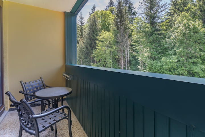 Trek je na een dag op de pistes terug in onze comfortabele LEEFRUIMTE. Kruip op de bank en geniet van je favoriete programma's op de smart-tv of kijk je favoriete film met onze dvd-speler (op aanvraag beschikbaar) in de open woonkamer. Je kunt gemakkelijk contact maken met vrienden en familie thuis, met dank aan de gratis wifi. Luister naar wat muziek met de meegeleverde Bluetooth-klokradio. Houd er rekening mee dat niet alle accommodaties een balkon of patio hebben. Hoewel sommige accommodaties uitzicht op de bergen bieden, kunnen we niet garanderen dat gasten er een krijgen. Helaas kunnen we geen speciale verzoeken met betrekking tot kameruitzichten inwilligen.