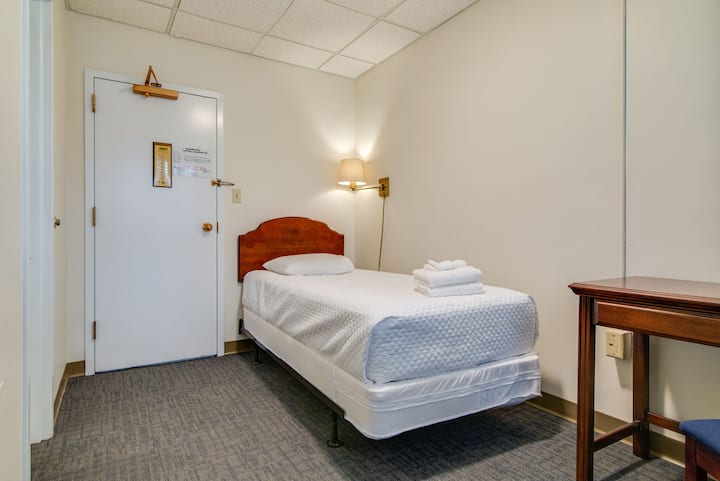 Onze twin suite is gelegen in een van de oude slaapzalen van wat ooit Scarritt Bennett College voor christelijke arbeiders, dan later Scarritt Graduate School (meer geschiedenis over de campus hieronder). De suite bestaat uit twee kamers grenzend aan een complete badkamer met een bad/douche combo. Elke kamer van de suite is ongeveer 100 sq ft. Met de badkamer is de totale ruimte ongeveer 250 vierkante voet. Verwacht een kamer zonder franje, maar op een campus die lijkt op een Europees klooster of durf we zeggen, Zweinstein...