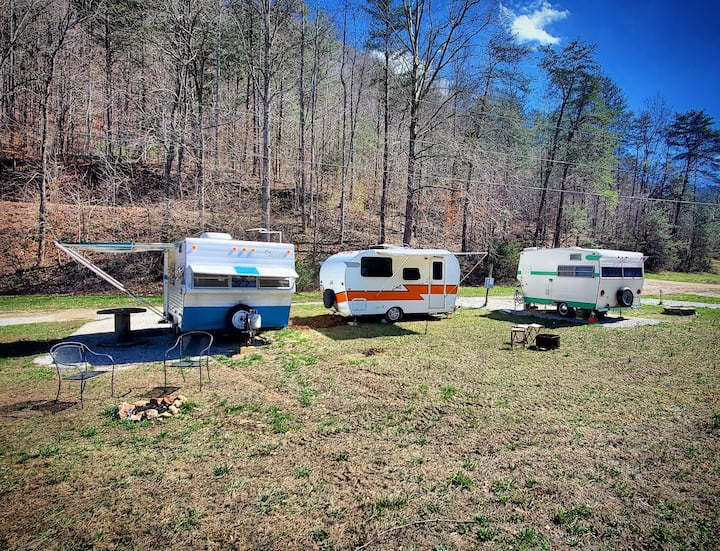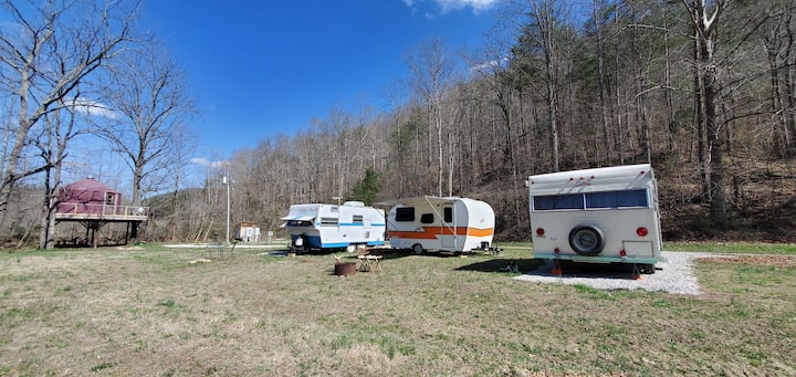 Tammy Tanager is een van de drie Shasta campers op de boerderij. Je kunt elke camper afzonderlijk huren of een paar vrienden meenemen en alle drie boeken met behulp van de Three Little Birds-advertentie. De campers bevinden zich in het deel van de boerderij dat we Tiny Town noemen, omdat er meerdere, aangrenzende locaties zijn vanwege de toegankelijkheid van elektriciteit en water in dit gebied. Als je op zoek bent naar afzondering en privacy, raden we onze Yome Away from Home, de Treetop Flyer of de Wabi Sabi Studio aan.
