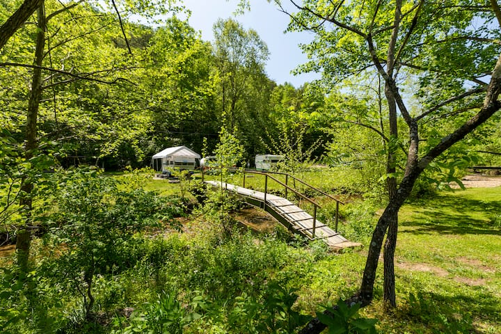DE BOERDERIJ: We zijn een boerderij in de bergen, dus we hebben al het goede (prachtige uitzichten, kabbelende beek, wandelpaden) en de slechte (insecten, huilende coyotes, gifsumak) die de natuur te bieden heeft, dus kom voorbereid. We raden wandelschoenen, insectenspray en door het weer geschikte kleding aan. Wees voorbereid om INSECTEN tegen te komen (muggen, teken, chiggers), WILDE DIEREN (herten, kalkoenen, slangen, padden, en durven we het berenpad noemen dat we een lente hebben gezien?), WEER (warm, koud, regen, sneeuw), GIFTIGE PLANTEN (poison ivy, poison ivy, pijlstaartnetel, brandnetel, wilde paddenstoelen), om er maar een paar te noemen. Er is een steile en ruige wandellus van 1,5 mijl die de meeste mensen ongeveer een uur kost (als ze voorbij de eerste klim van 10 minuten bergopwaarts kunnen komen). We hebben ook schommels in de speeltuin, discgolf, hoelahoep, een croquet-set en een beek vol geodes om op te jagen. Laat geen stokken, rotsen, speelgoed of andere spullen achter in het gras waar we moeten maaien.