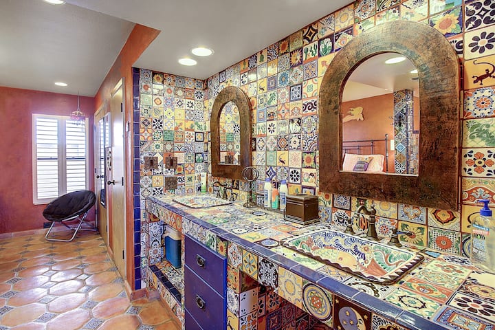 Terra-cotta tegelvloer, decoración náutica en op maat gemaakt houten plafond met muur tot muur ramen en patiodeur.