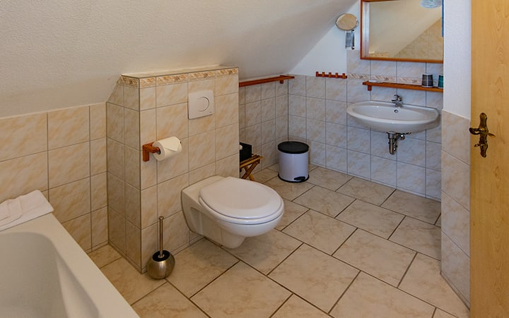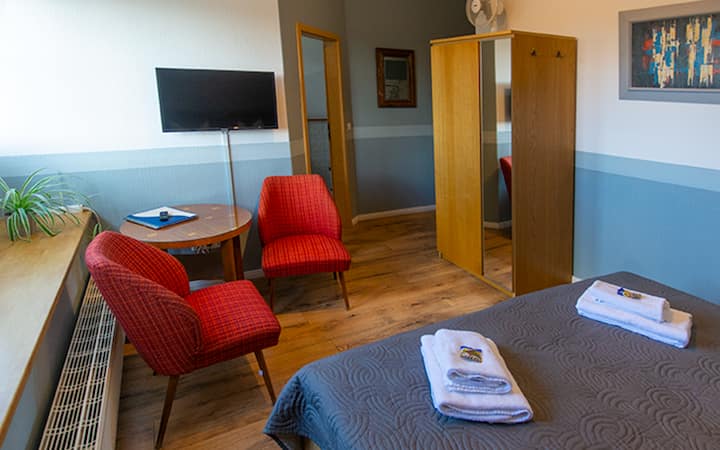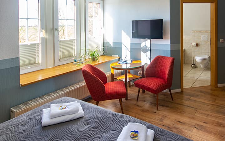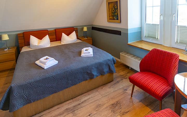 Onze comfortabele Aurora Tweepersoonskamer boven in het hoofdgebouw is een handige en gezellige plek om te verblijven tijdens het verkennen van Rügen voor een paar dagen. Kom naar huis naar het comfort van Himmelreich.