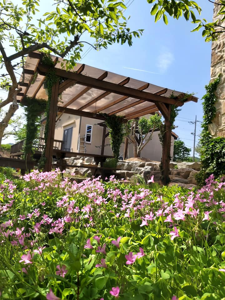 Ze willen allemaal in de natuur leven als een thuisinstituut, maar ik kan niet in veel situaties leven, maar ik wil mijn ruimte delen zodat ik een tijdje kan genieten of genezen, dus heb ik Mumura hier geopend. Deze plek heeft een steen vertrapt op één boom, van de fundering tot het ontwerp architectonische interieur, en ik heb stap voor stap een hoofdhuis en twee aparte huizen gemaakt. Het is een platteland, dus er moet wat ongemak zijn, maar ik zal mijn best doen om me net zoveel voor te bereiden als ik verblijf.
