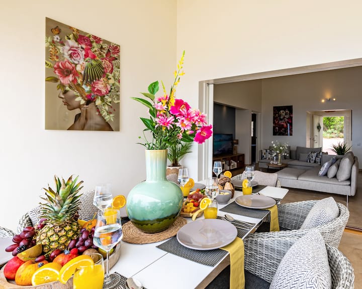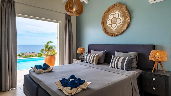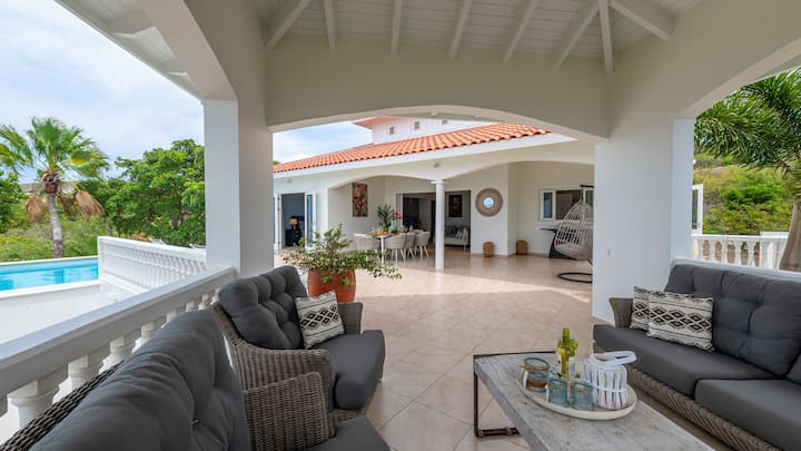 Ontspannend en charmant huis met privézwembad en prachtig uitzicht op zee. In de chique buurt Coral Estate met 24-7 beveiliging. Op loopafstand van prachtige natuur voor heerlijk wandelen, duiken, snorkelen en genieten van de prachtige turquoise blauwe zee of ontspannen op het charmante, schaduwrijke strand. Slechts 15 minuten rijden van meer van de mooiste stranden en duikplekken die Curacao te bieden heeft (meer dan 25!). Geweldige plekken om te eten, een verfrissend drankje te drinken, naar de flamingo 's te kijken, lokale kunstenaars te bezoeken, te paard te gaan of wat boodschappen te kopen binnen 15 minuten met de auto. Het historische en wereldberoemde stadscentrum van Willemstad, het onlangs geopende winkelcentrum Sambil International en een van de 3 golfbanen die het eiland te bieden heeft liggen op 30 minuten rijden. Het huis biedt veel privacy en laat u genieten van het prachtige uitzicht, of u nu ontspant in de woonkamer, afkoelt onder de wind, geniet van de zon op het dek of een duik neemt in het zwembad.