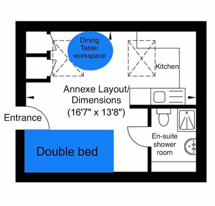 Gehele Studio Annexe - Slaapkamer/ Eetgedeelte, Keuken, En-suite doucheruimte.