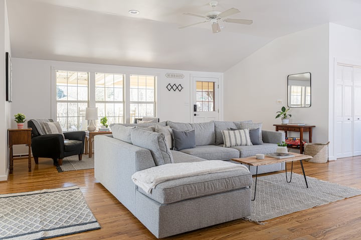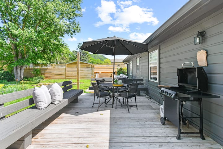 Prachtig uitzicht op de bergen, tuin huis retraite. 5 minuten lopen naar het centrum - 3 slaapkamers, 2 badkamers, bubbelbad, dek, grill. Moderne woonkamer, gezellige sectionele, 55 inch tv, luxe beddengoed, gevulde keuken. Voorportaal met schommelstoelen en prachtig uitzicht voor luie middagen. Zorgvuldig onderhouden. Alle voorzieningen die nodig zijn - goed uitgeruste keuken, eethoek, wasmachine/droger, parkeergelegenheid. Hondvriendelijk. Wandelen naar Appalachian Trail, French Broad River, restaurants, brouwerij, winkels en natuurlijke warmwaterbronnen.