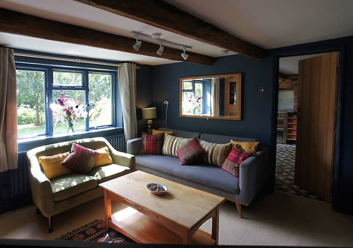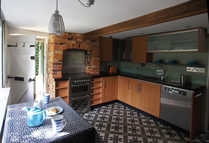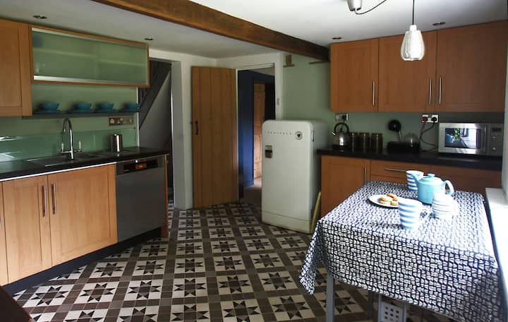 Net bij de voordeur is een kleine bijkeuken met wasmachine en droger. Buiten aan de voorzijde is een kleine privétuin in cottagestijl met gazon, buitenzitje en BBQ. Het is zonnig en beschermd tegen de wind. Aan de achterzijde is een groot grasveld met wilde bloemenweide (bloeiende in het midden van de zomer) en een eigen graspad dat tussen de velden en op openbare wandelpaden leidt - geweldig om te wandelen.