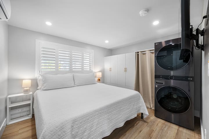 ~ Hoofdslaapkamer: Rust uit in de rustige hoofdslaapkamer met een zacht kingsize bed, zacht beddengoed en voldoende opbergruimte voor je bezittingen. Word opgefrist wakker en ga 's ochtends naar buiten voor een kopje koffie op je eigen patio aan de achterkant.