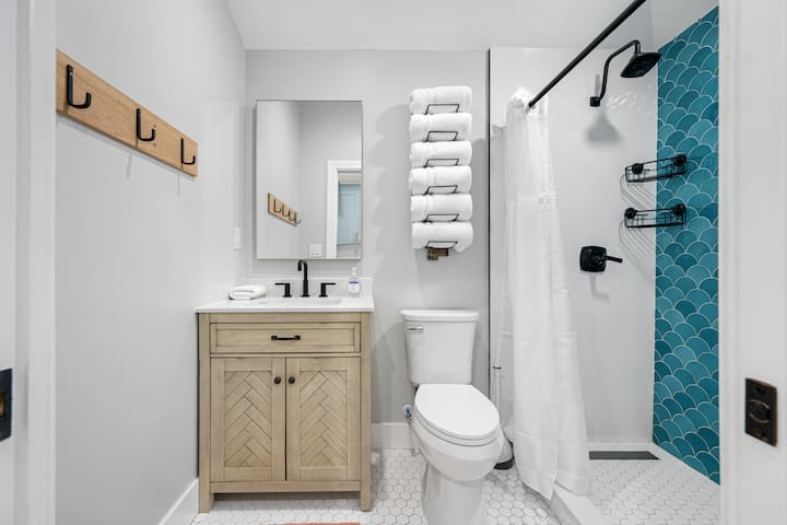 De ongerepte badkamer van het huisje biedt een prachtig betegelde inloopdouche, schone handdoeken en alle benodigdheden die je nodig hebt om je op te frissen na een dagje strand.