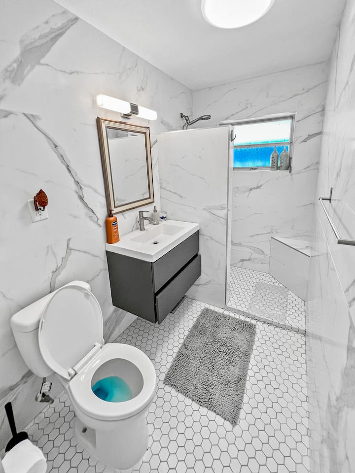 De woning beschikt over een ontspannende complete badkamer gevuld met schone handdoeken en essentiële toiletartikelen voor maximaal comfort en gemak.